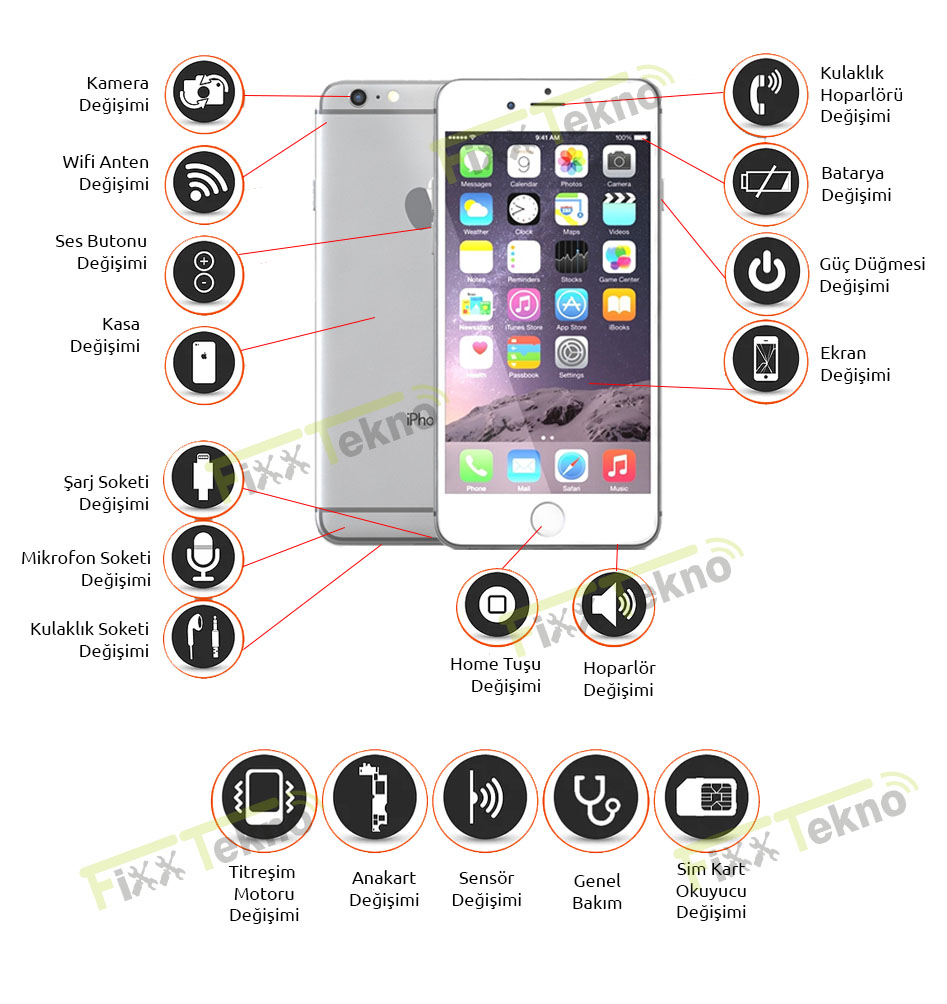 İphone 6 S Cihazlarında Ekranının Kırılması, Batarya, Kasa, Şarj Soketi, Ön Ve Arka Kamera, Ana Ekra Home Tuşu, Ses Tuşu , İç Kulaklık, Güncelleme Sorunu, Anakart Tamiri, U2 Şarj Sorunu, Şebeke Sorunu , Hafıza, Dokunmatik, Işık, Ses, Bluetooth, Wifi Arızaları, Yazılım Güncelleme, Yazılım Hataları Gibi Birçok Sorunun Çözümünde Sizlere Hizmet Verebiliriz.