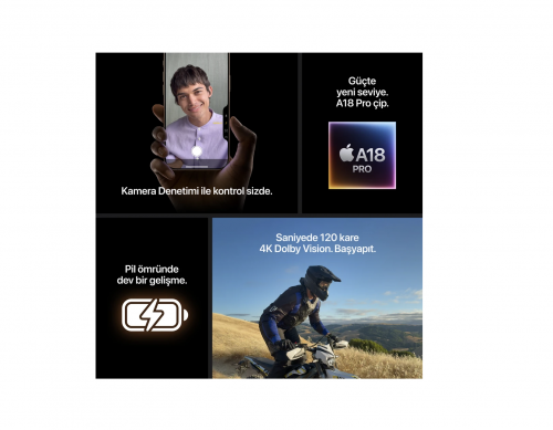 A18 PRO ÇİPİN GÜCÜ — A18 Pro çip, Kamera Denetimi gibi gelişmiş video ve fotoğraf özelliklerine güç veriyor ve AAA oyunlar için olağanüstü bir grafik performansı sunuyor.