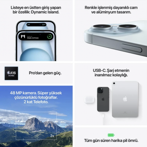 USB-C BAĞLANTISI — Yeni USB-C konnektörü sayesinde, iPhone 15’inizi şarj ettiğiniz kabloyla Mac’inizi veya iPad’inizi de şarj edebiliyorsunuz. Hatta iPhone 15’inizi Apple Watch veya AirPods şarj etmek için kullanabiliyorsunuz.